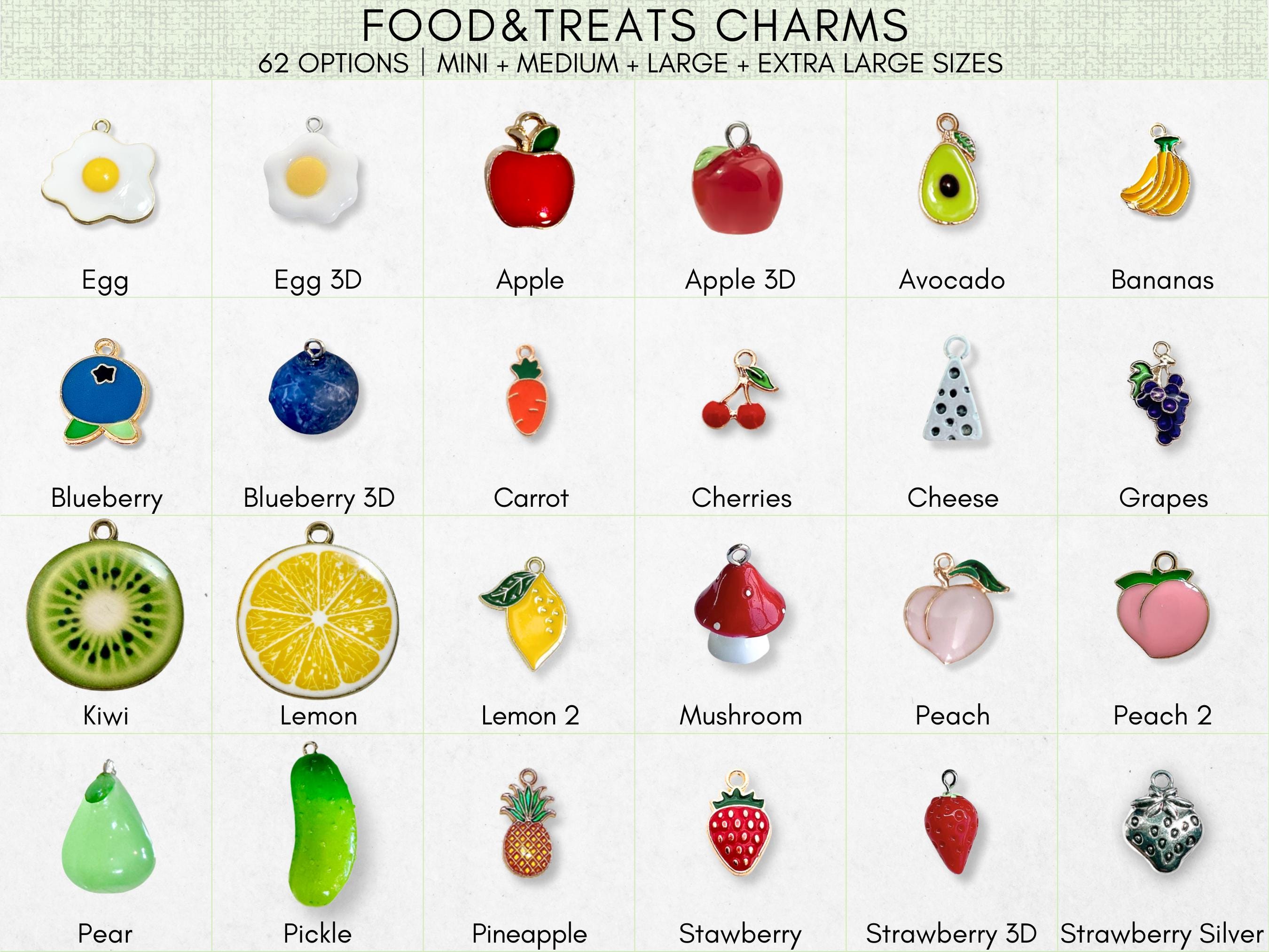 Infuse your pet's style with playful charm using our whimsical food themed charm collection, designed especially for cats and small dogs. Each lightweight piece features colorful food charms like apple, avocado, and coffee, crafted to add a splash of personality and fun. With matching split rings included, these removable cat collar charms make accessorizing effortless and delightful.