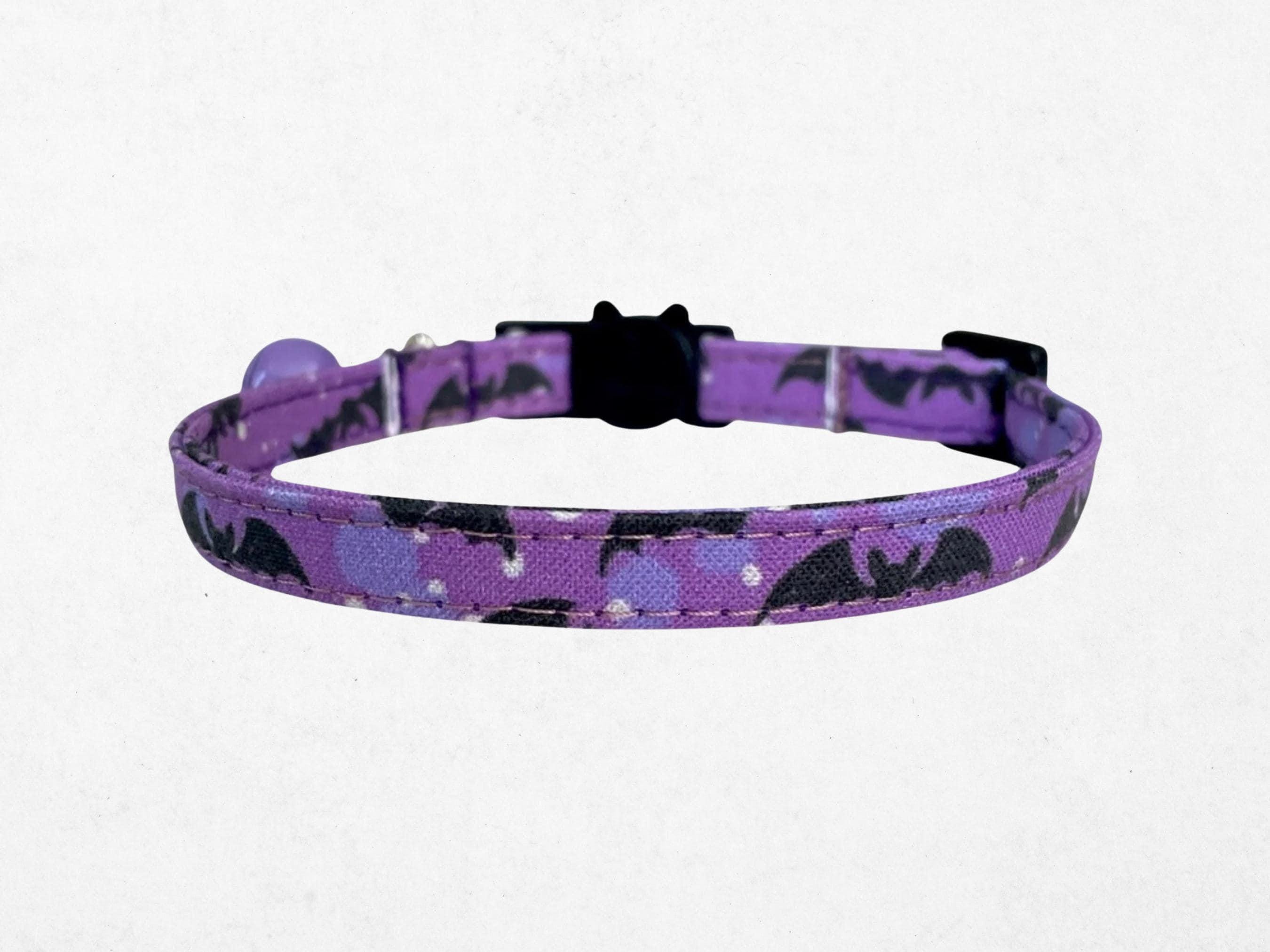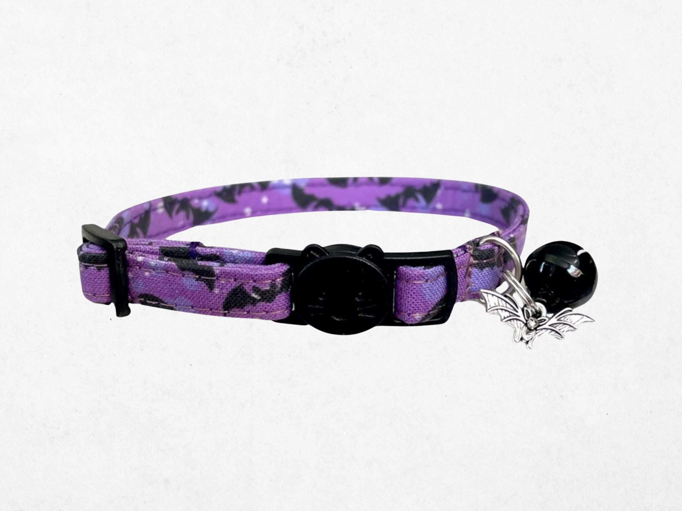 Celebrate the mysterious allure of autumn with this purple bat collar, designed for small dogs and cats who love a touch of gothic pet accessory style. Featuring an adjustable breakaway buckle, this collar blends safety and spooky pet wear seamlessly, perfect for Halloween or everyday emo cat fashion. Handcrafted with care, its black and purple hues make it a standout piece for your furry friend's unique personality.