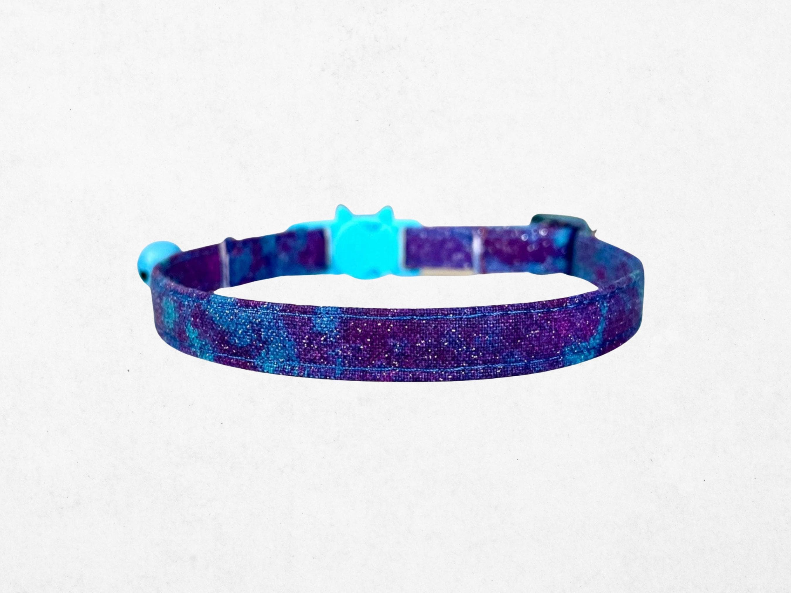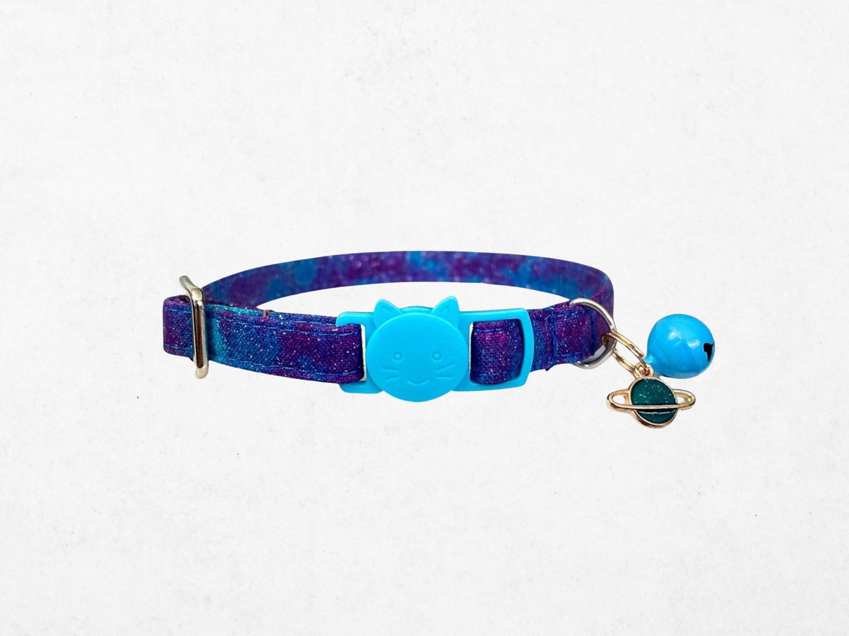 Experience the wonder of the cosmos with our galaxy cat collar, a glittery design inspired by the starry night theme that adds celestial charm to your pet's everyday wear. Crafted for comfort and style, this handmade cat collar is perfect for both cats and small dogs, featuring an adjustable fit and bell and charm ready for a personalized touch. Let your furry friend shine with a collar that captures the magic of the starry sky.