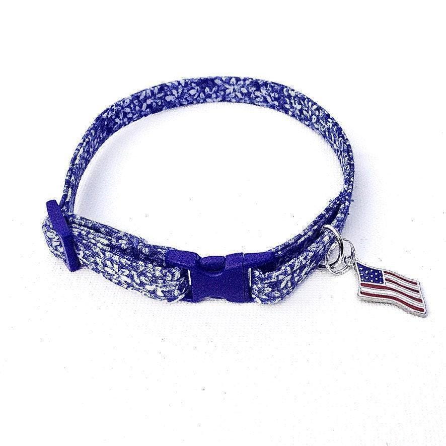 Celebrate your pet’s patriotic spirit with this handmade breakaway cat collar featuring a vibrant USA flag design. Crafted for comfort and safety, this collar includes a secure safety buckle and a convenient D-ring attachment, perfect for small dogs and cats alike. Whether you're looking for a unique cat collar gift or seasonal bell charm addon, this lightweight fabric collar combines style with practical features.