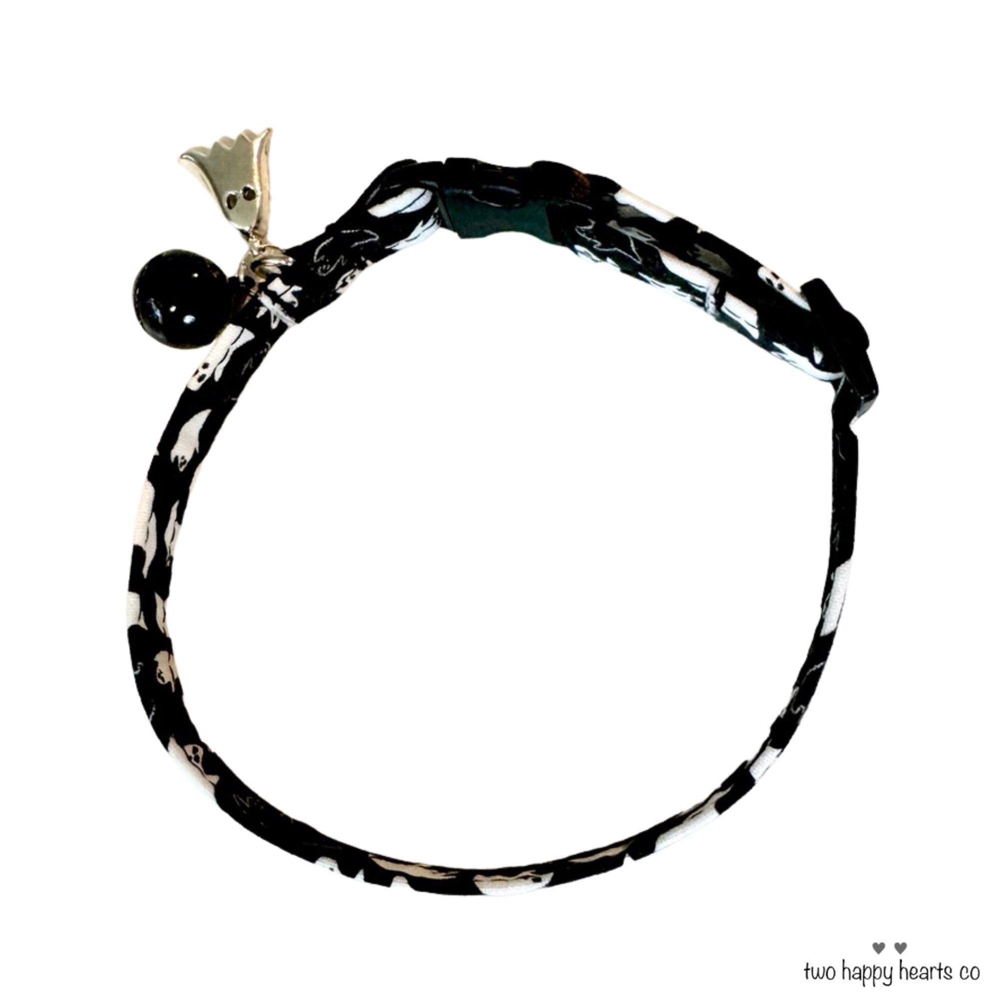 Celebrate your pet's unique charm with this ghost cat collar, designed especially for Halloween fun and everyday comfort. Crafted with a secure breakaway buckle and featuring a convenient D ring attachment, this collar ensures both safety and style for your furry friend. Perfectly adjustable to fit kittens and small dogs, it combines a medium-firm feel with lightweight fabric for a comfortable, secure fit.