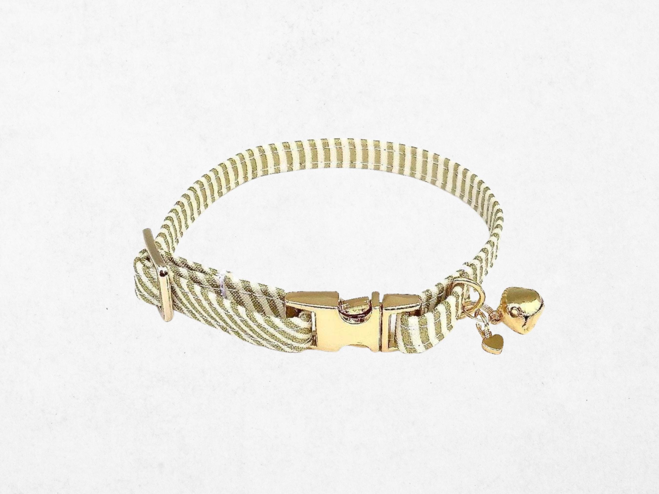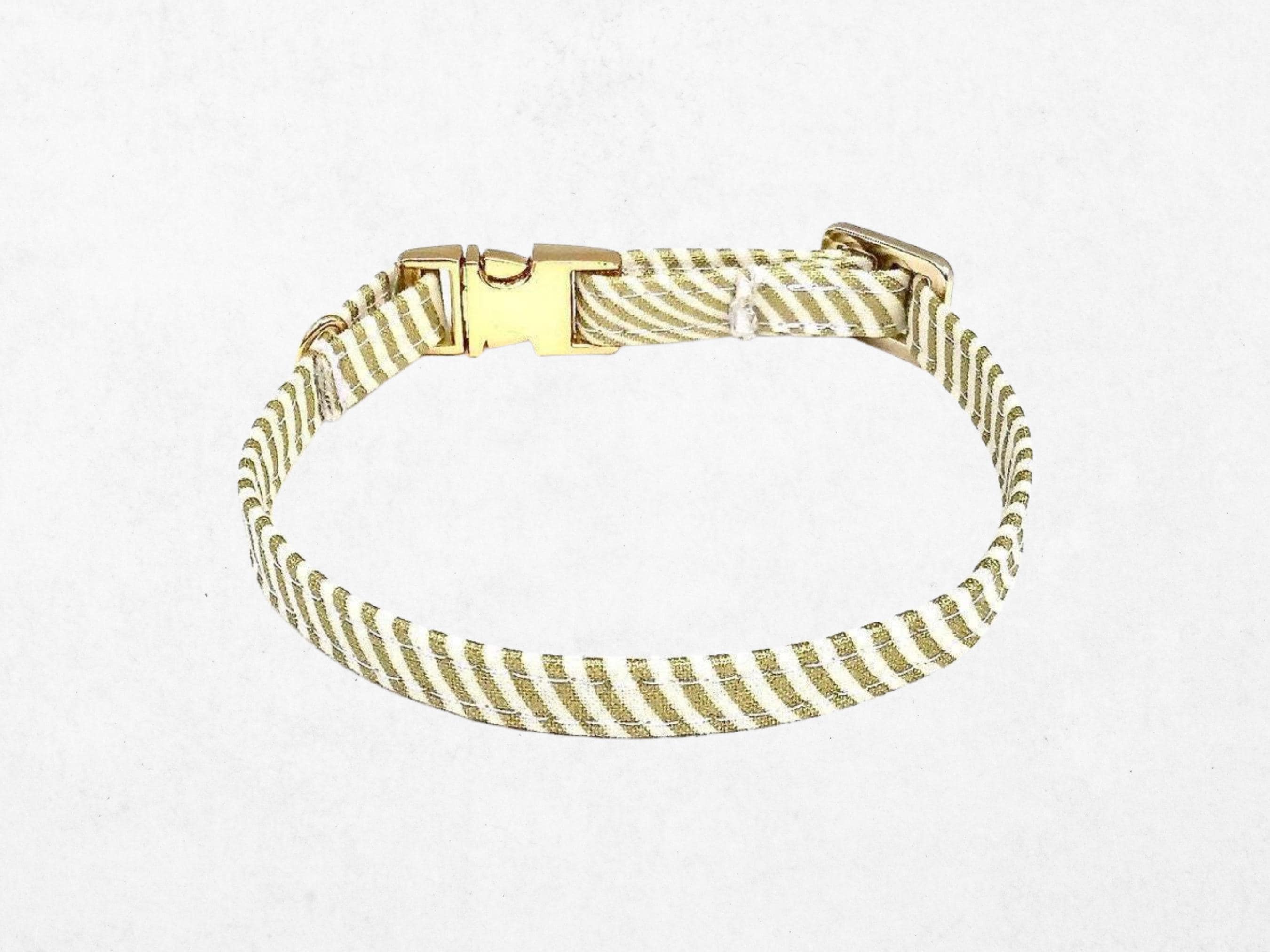 Discover the perfect blend of style and safety with our gold striped collar, thoughtfully designed for cats and small dogs. Handmade with care, this cat collar stylishly features a metallic pattern that catches the light, while offering an adjustable fit to ensure comfort for your furry friend. Whether you prefer a breakaway buckle cat option or a sturdy non-breakaway buckle, this collar combines functionality with elegance.