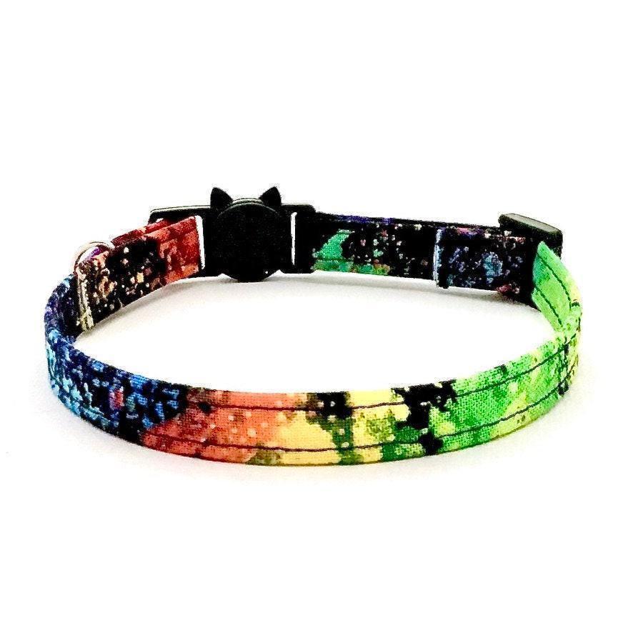 Brighten your pet’s day with this vibrant tie dye cat collar, a joyful accessory crafted to celebrate their unique spirit. Handmade with care, this colorful cat collar blends playful rainbow tie dye patterns with practical features designed for small pets. Featuring an adjustable fit and a secure D ring attachment, it’s perfect for keeping your kitten or small dog both safe and stylish.