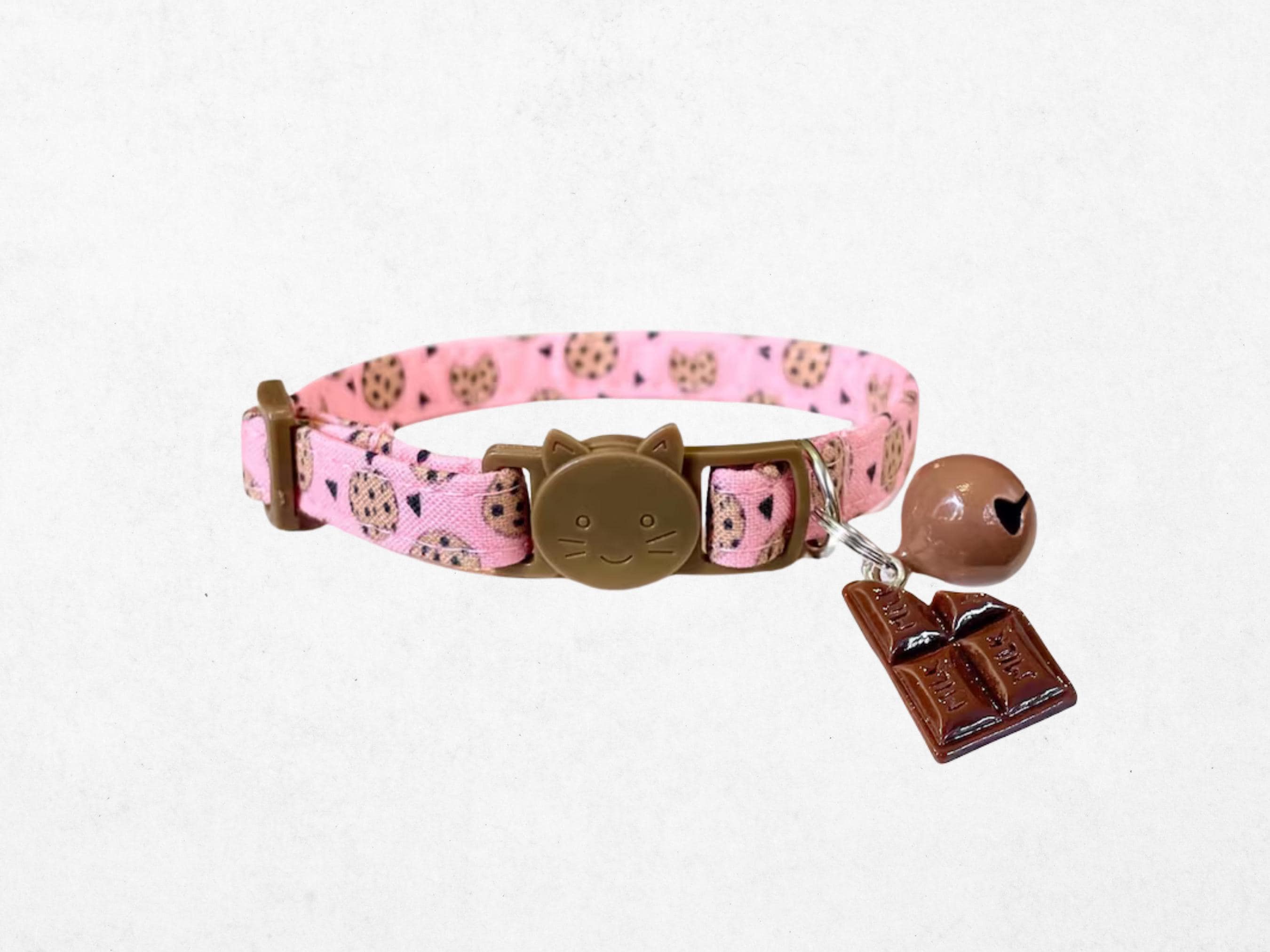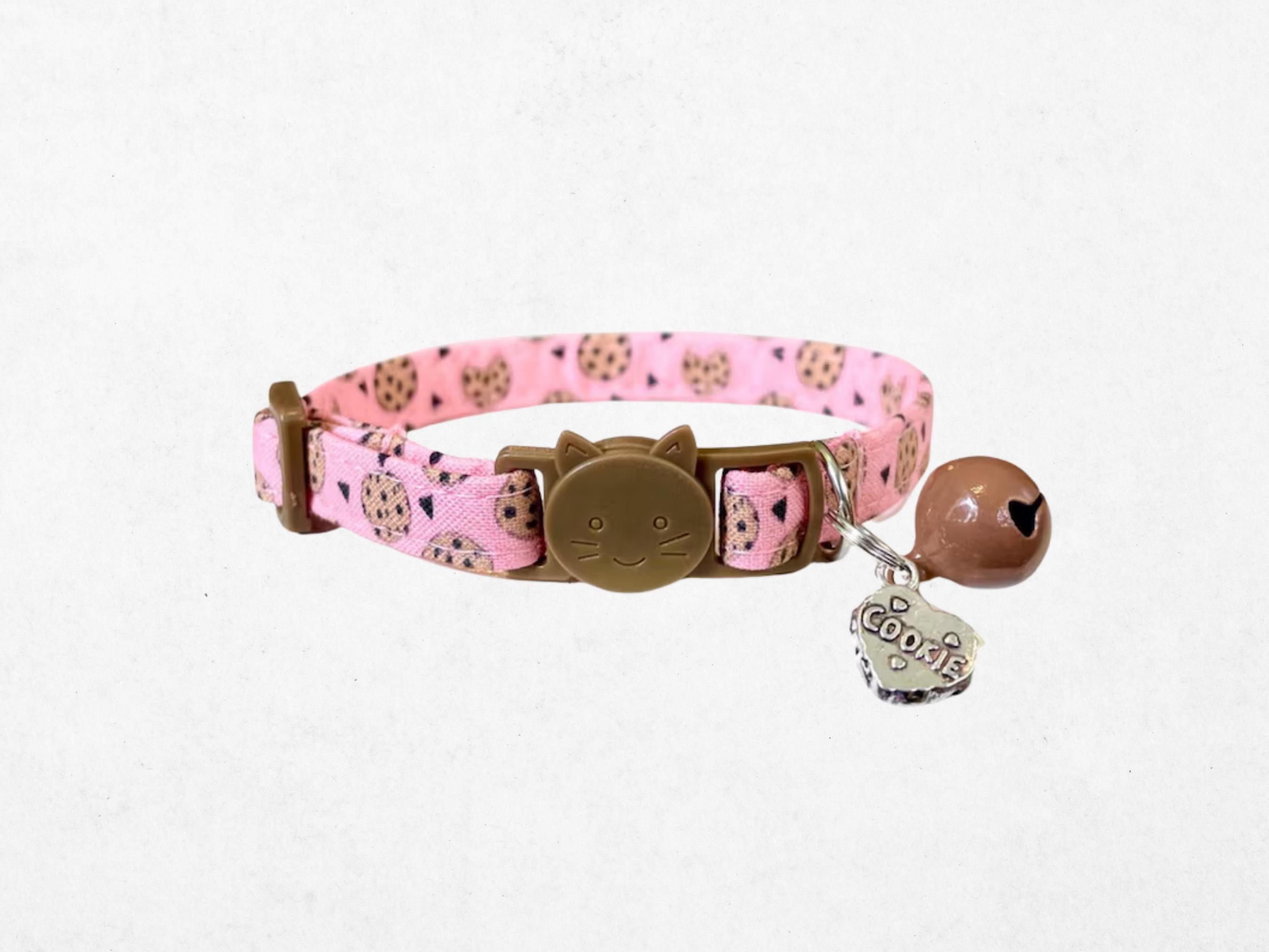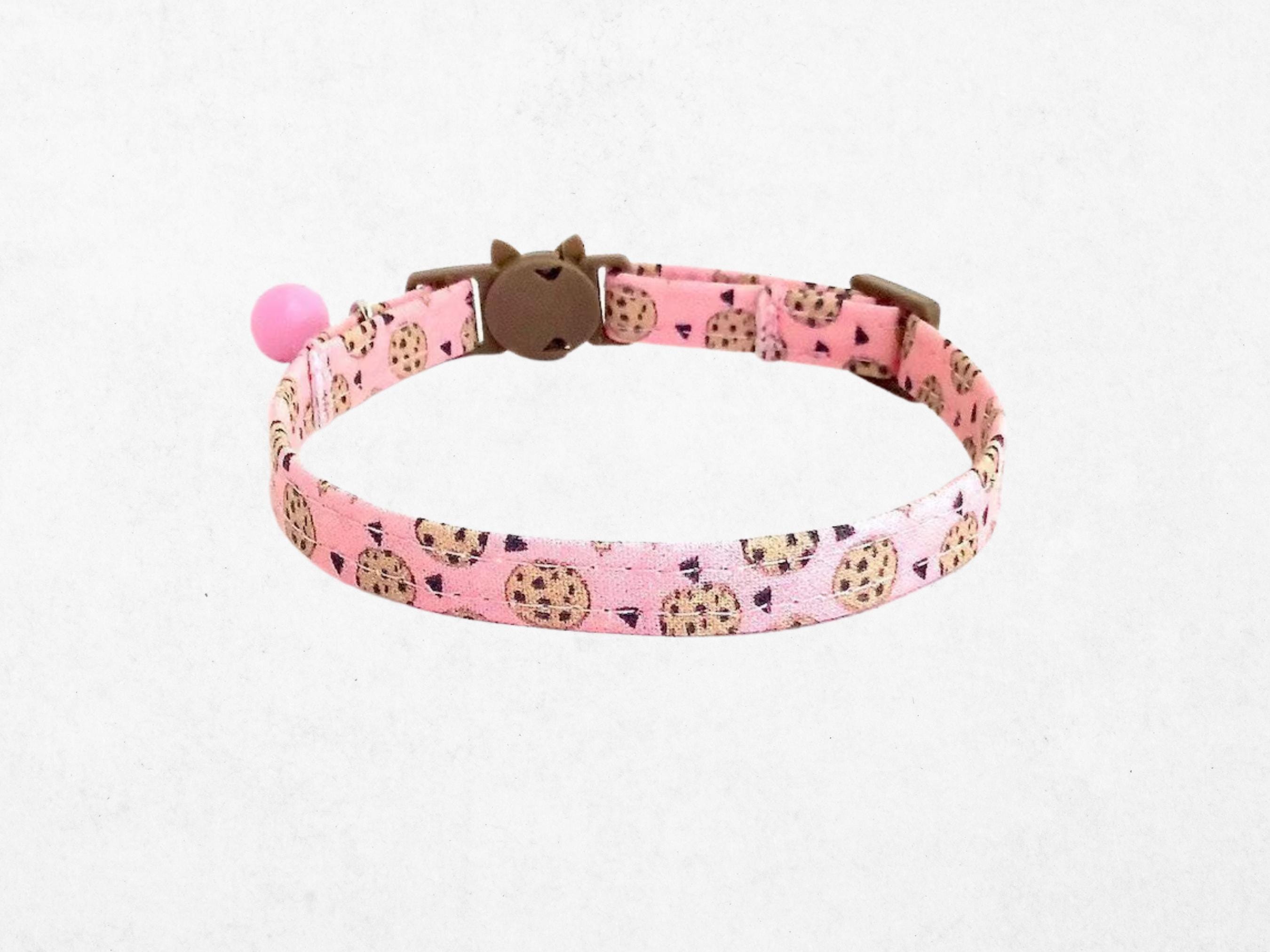 Discover the charm of our handmade cookie pet collar, designed with a delightful pink chocolate chip pattern that adds a touch of whimsy to your small dog or kitten's wardrobe. Crafted for comfort and safety, this adjustable pet strap features a secure breakaway cat collar buckle, ensuring peace of mind during playtime. Whether you're looking for a cute kitten collar or a sturdy small dog collar, this piece combines style and practicality seamlessly.