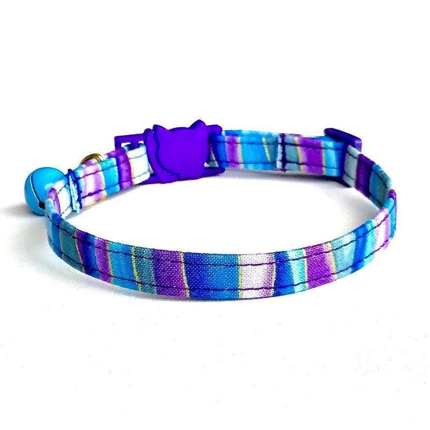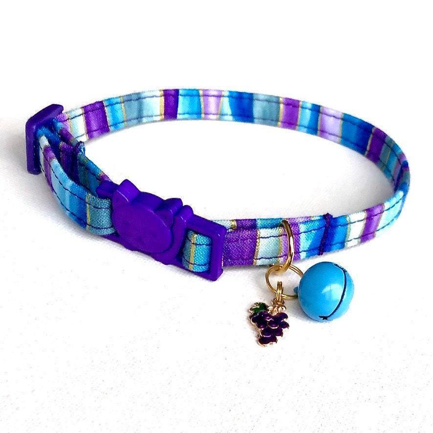 Discover the perfect blend of style and safety with this grape striped pet collar, thoughtfully designed for cats, kittens, and small dogs. Handmade with care, this comfort fit collar features an adjustable design and a sturdy D ring attachment, ensuring your furry friend looks adorable while staying secure. Whether you're seeking a kitten safety collar or a charming gift for a cat lover, this collar offers both function and flair.
