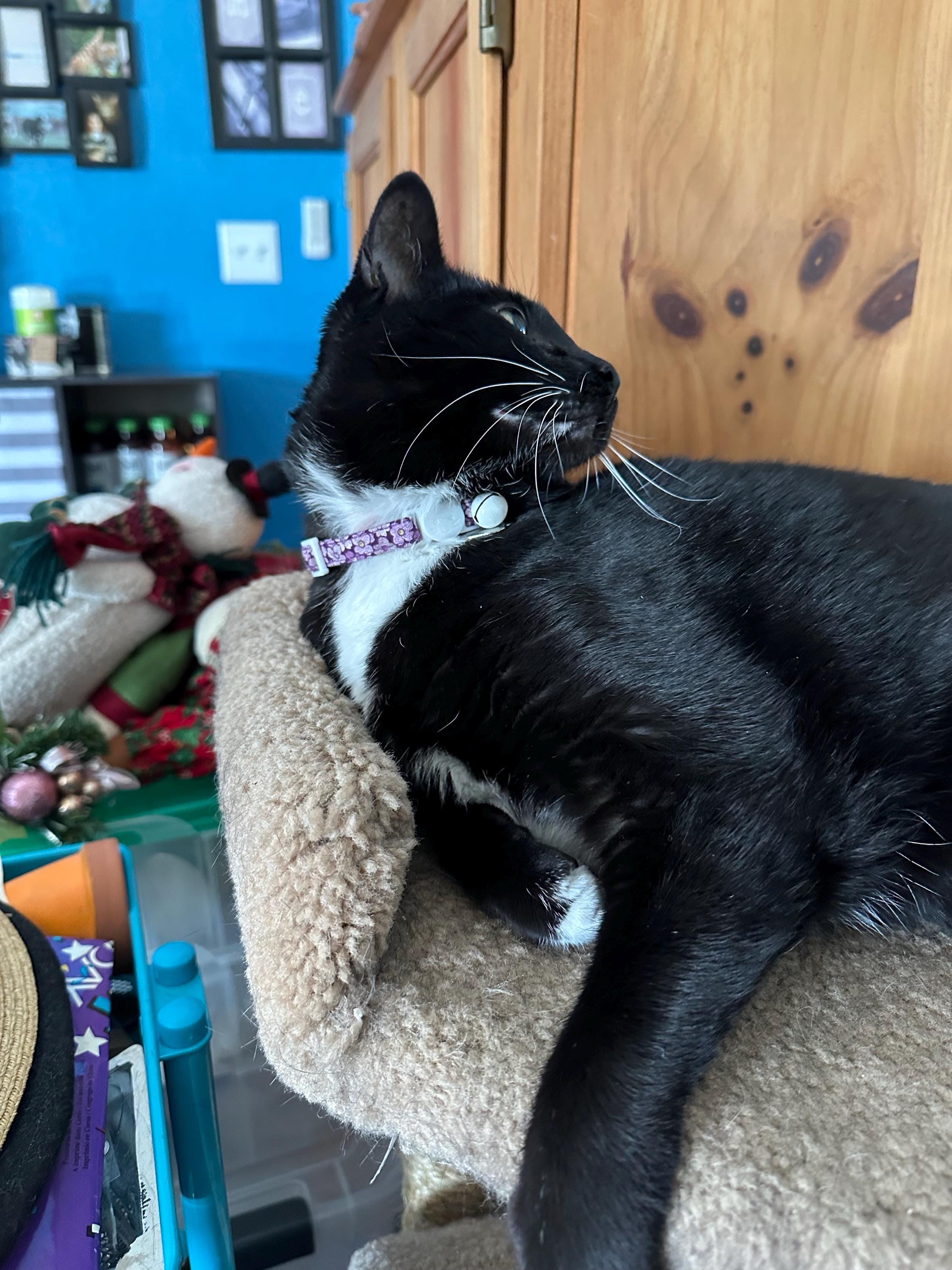 Lovely collar! I’ve bought several collars from this shop over the years, and they’re always of great quality. I especially like that they’re not too stiff, so they don’t irritate the cats’ necks.