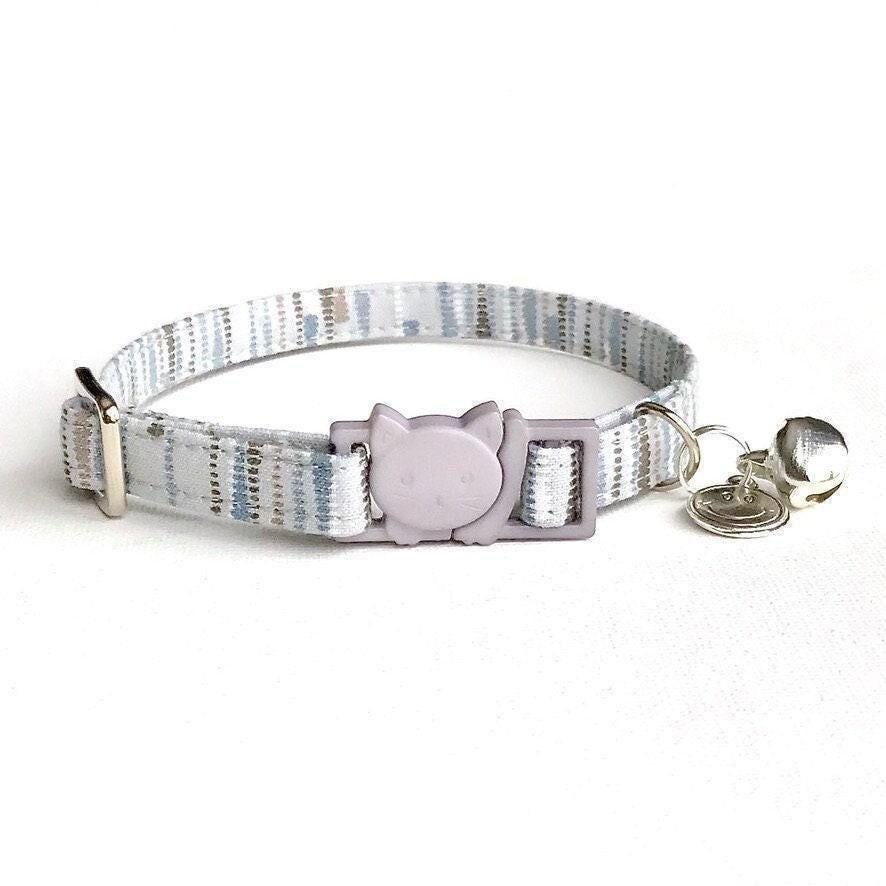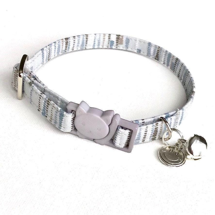 Every pet deserves a collar that combines safety, comfort, and style. This silver striped cat collar features a secure breakaway clasp designed to keep your furry friend safe, while the adjustable fit ensures comfort for cats and small dogs alike. Handmade with care, this collar also includes a sturdy D-ring perfect for attaching ID tags or charms, making it both practical and charming.