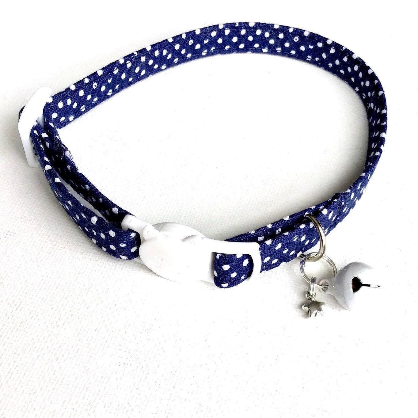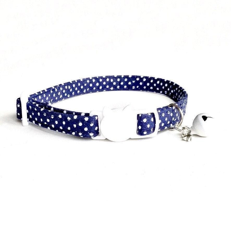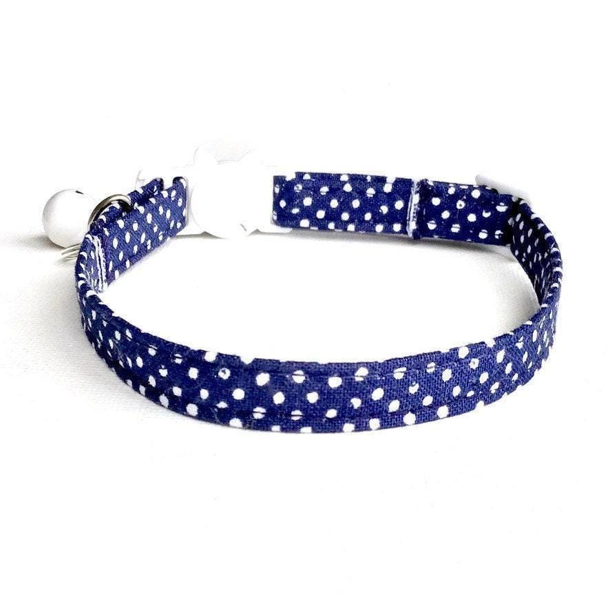 Every adventurous kitty or small dog deserves a collar that blends safety, comfort, and style seamlessly. This navy polka dot collar features a secure breakaway mechanism and a sturdy D ring included, making it perfect for keeping your furry friend safe while showcasing a fun polka dot design. Handmade with care, this comfort fit collar is designed to bring charm and peace of mind to every outing.