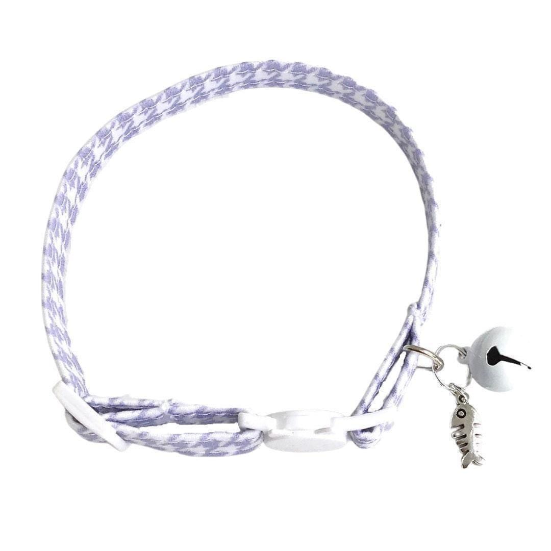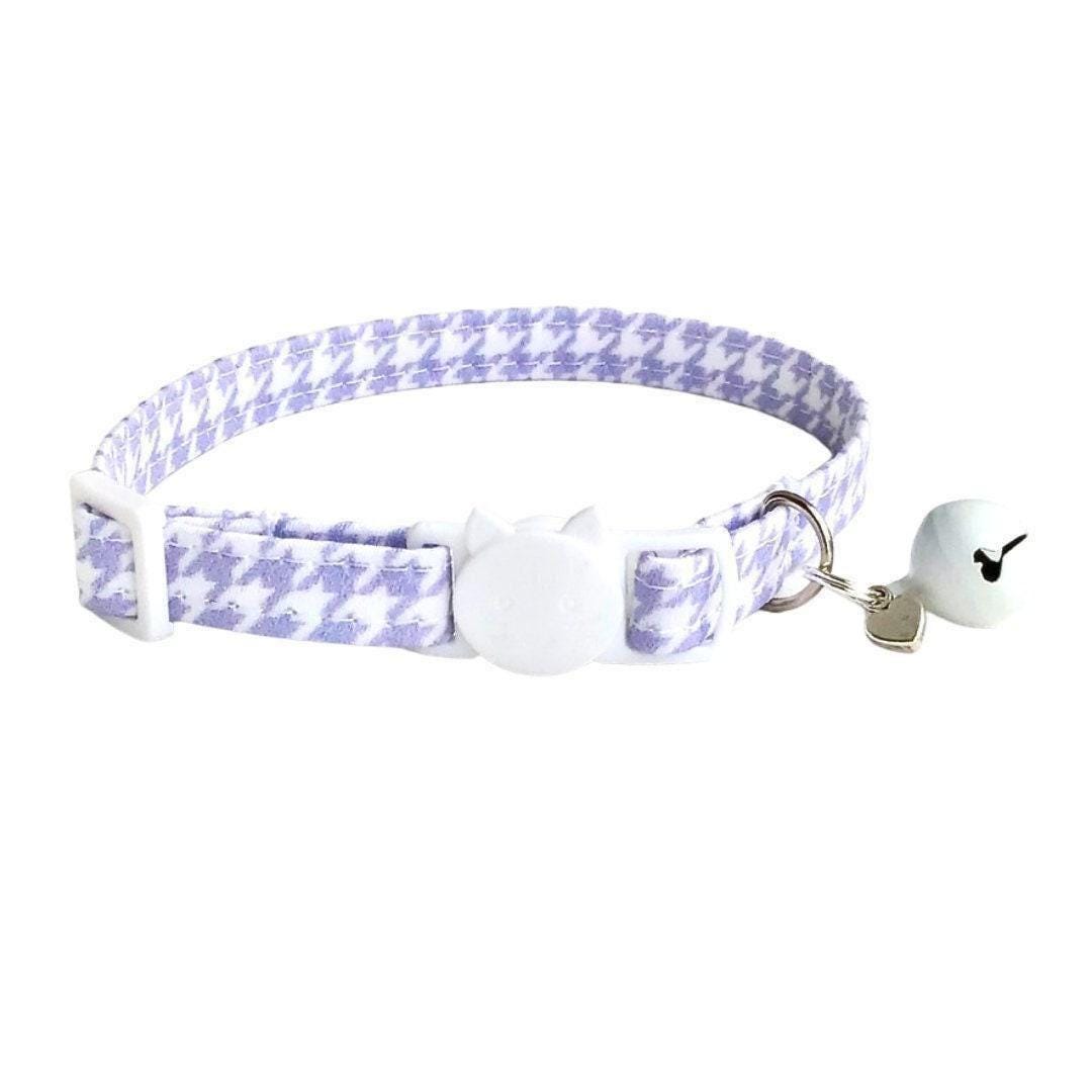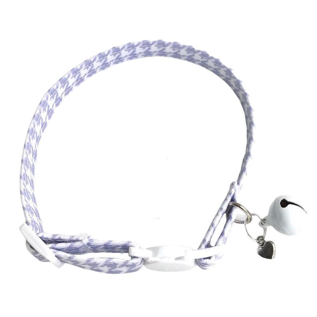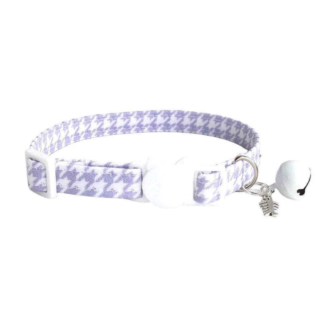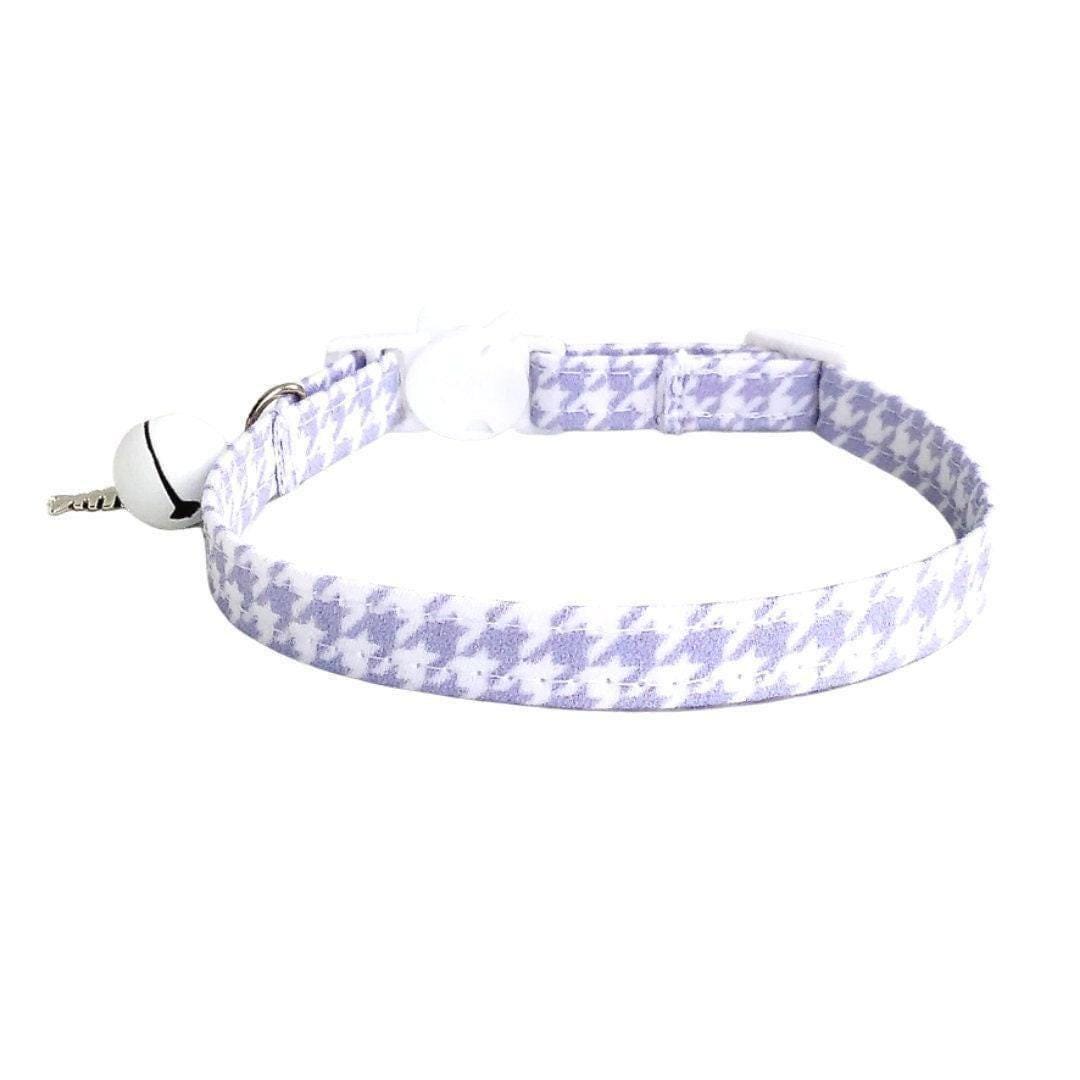 Discover the perfect blend of safety and style with this breakaway cat collar, designed thoughtfully for your small pet's comfort and security. Crafted in a delicate lavender houndstooth pattern, this light purple fabric accessory adds a charming touch while prioritizing your pet's well-being. With a sturdy D-ring included, it’s ideal for attaching ID tags or favorite charms, making it both functional and fashionable.