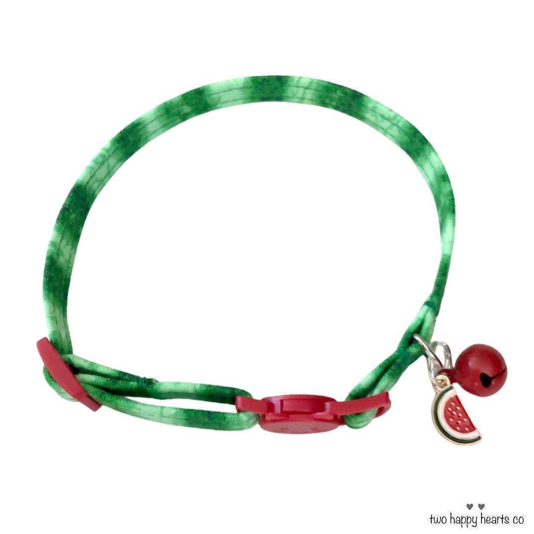 Celebrate the sunny spirit of summer with this vibrant watermelon collar, a perfect summer cat collar that brings a splash of joy to your pet’s day. Designed with small dogs in mind as well, its playful fruit pattern captures the carefree essence of warm days spent outdoors. Crafted for comfort and safety, this collar features an adjustable breakaway buckle ensuring a secure fit and peace of mind.