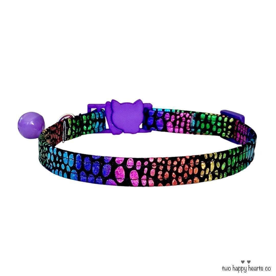 Discover the perfect blend of safety and style with this handmade breakaway cat collar, designed with a shiny metallic snakeskin pattern that adds a touch of flair to your pet's everyday look. Crafted for comfort and durability, this stylish pet collar features an adjustable fit and a secure safety buckle to keep your feline or small dog safe during their adventures. Whether you're looking for a small dog collar or a unique gift for a cat lover, this collar combines function and fashion effortlessly.