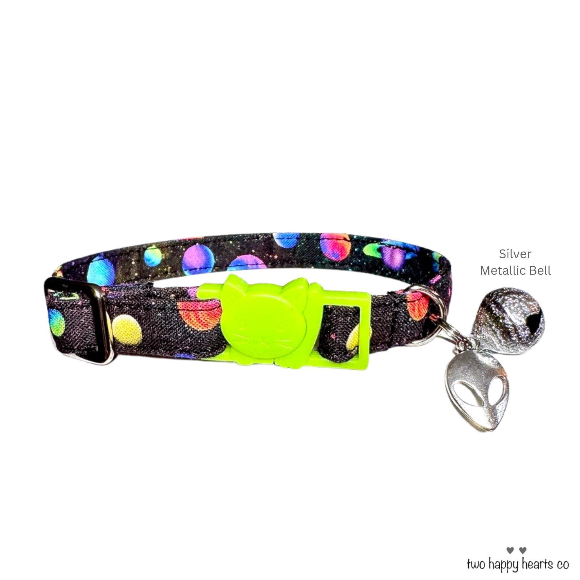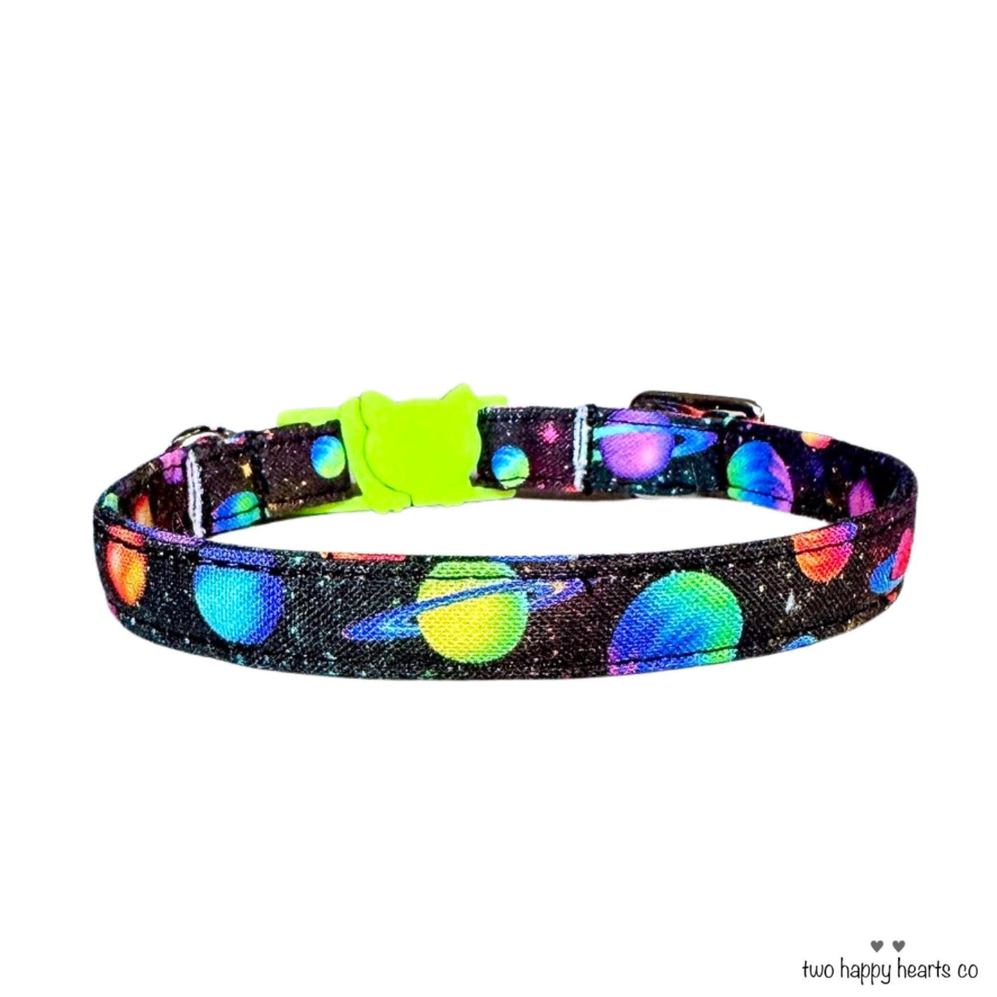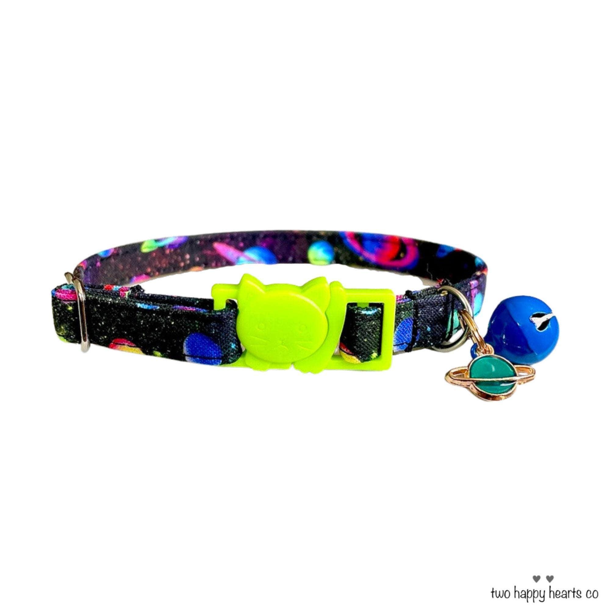 Celebrate your cat's individuality with this vibrant collar adorned in a neon space pattern that captures the wonder of the cosmos. Crafted for comfort and safety, the breakaway buckle ensures your pet stays secure while allowing quick release if needed. Perfect as a safe kitten collar or a small dog collar, this handmade piece combines style and function with an adjustable fit and charming details.
