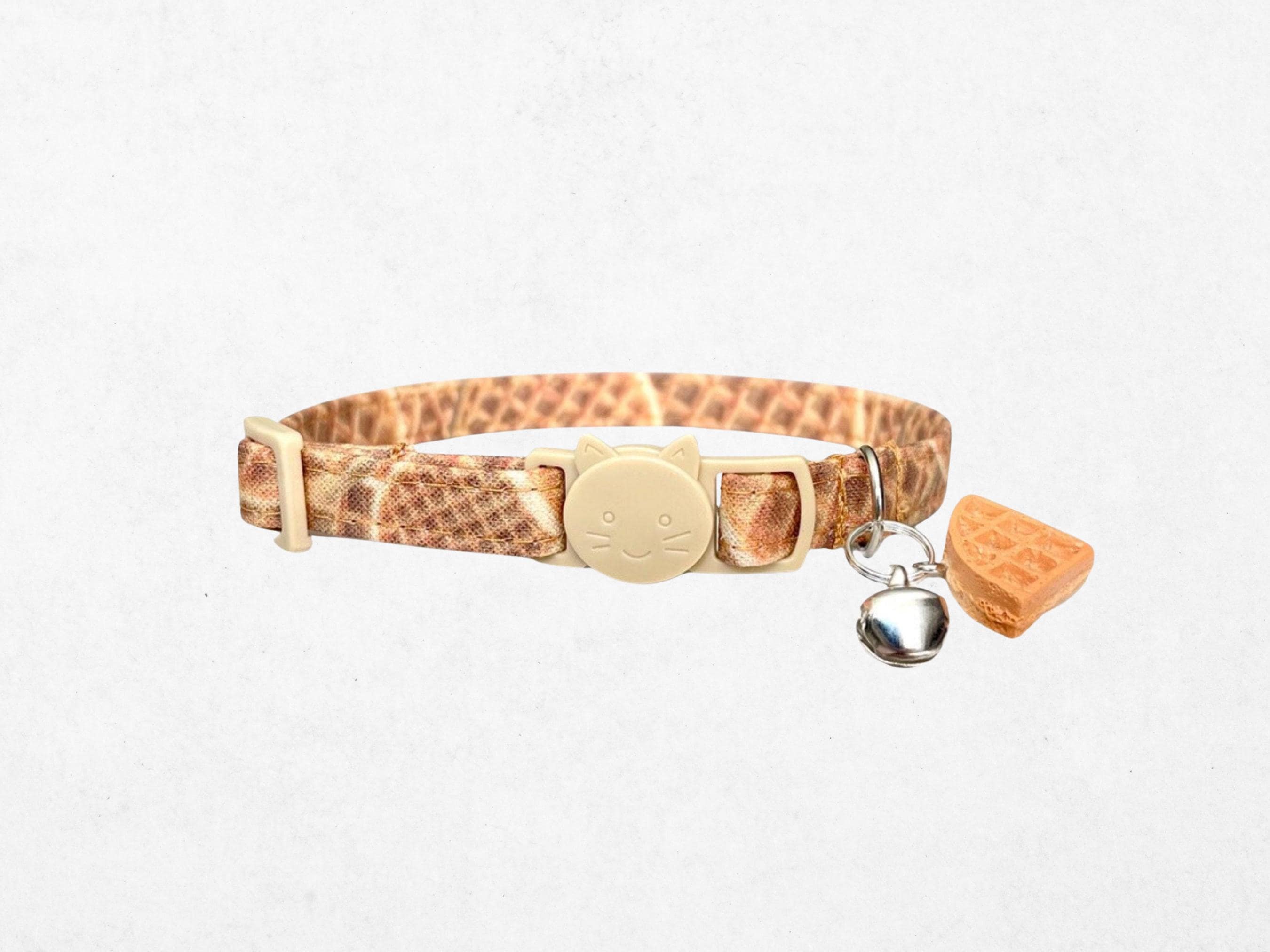 Discover the charm of our waffle cat collar, featuring a delightful cute food print that adds a playful touch to your pet's everyday style. Crafted with an adjustable breakaway buckle, this collar ensures your cat's safety without compromising on comfort or design. Perfect for small kittens and tiny dogs, this accessory blends whimsy and practicality in one lightweight, secure strap.