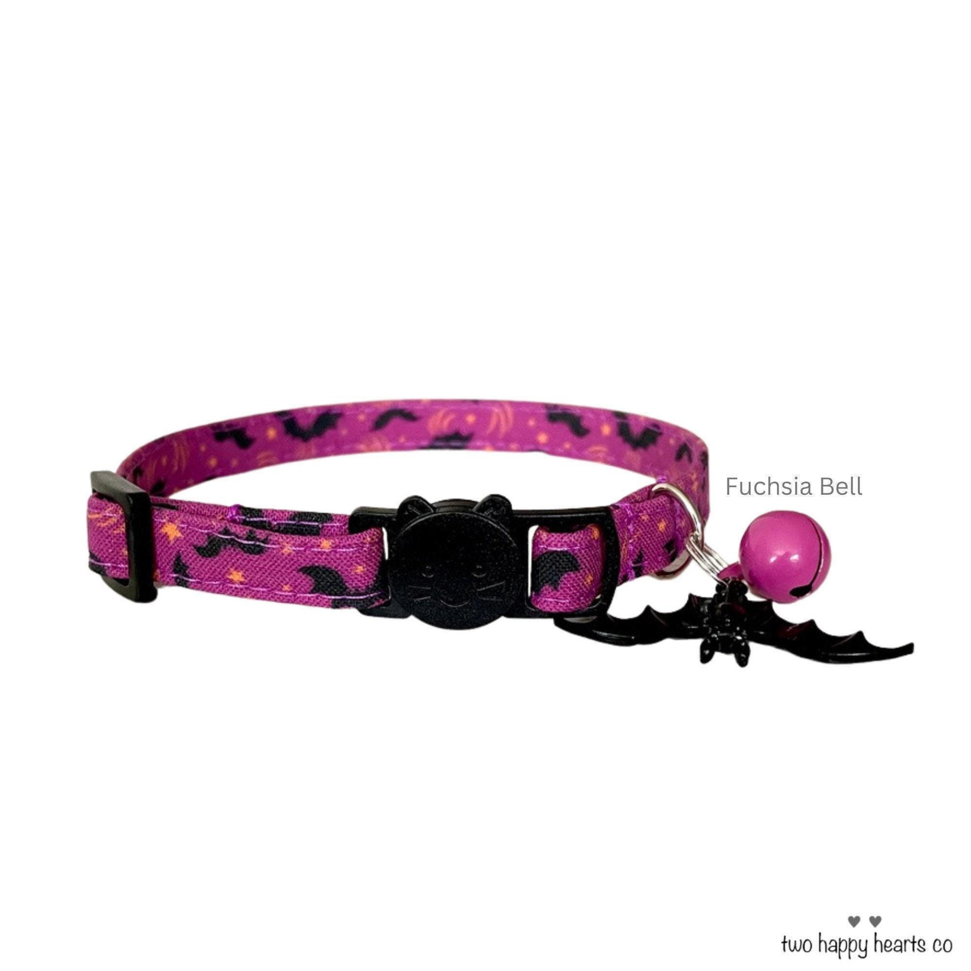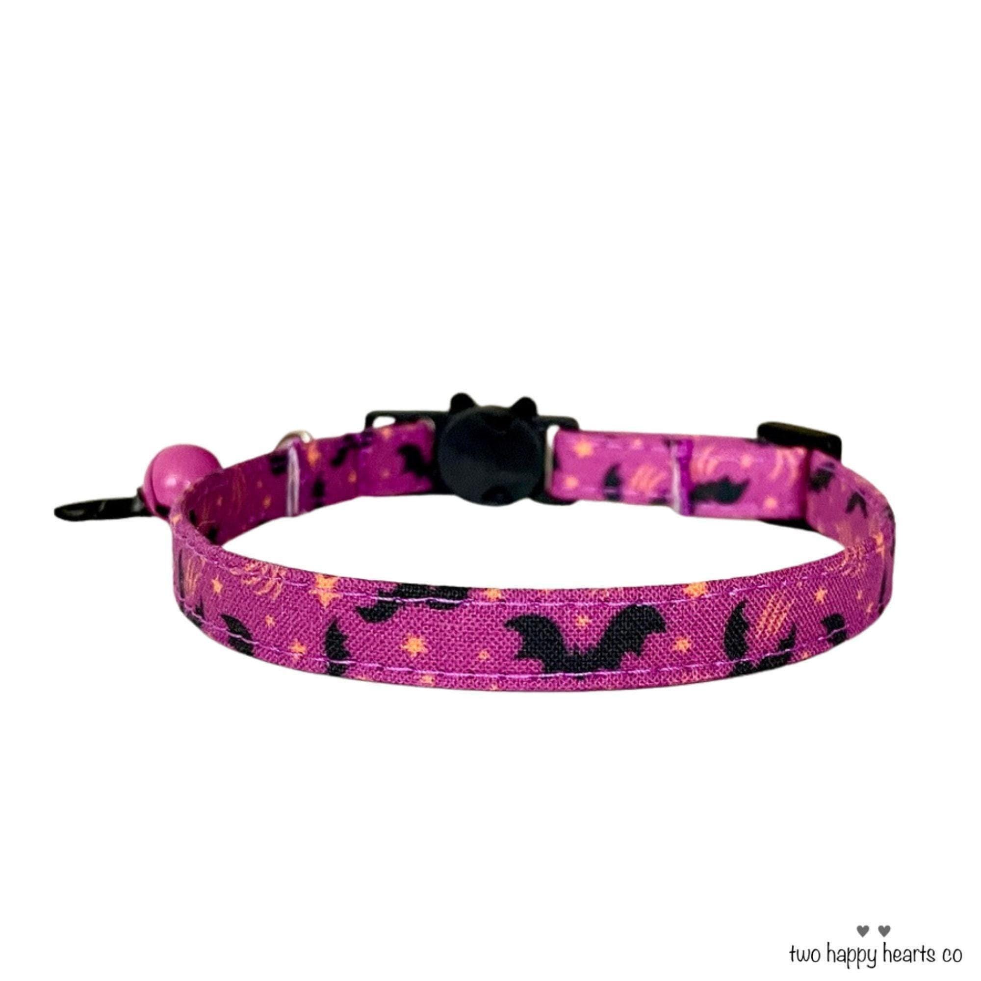Celebrate your pet's playful spirit with our handmade Halloween cat collar, featuring a striking magenta bat design that brings seasonal charm to any outfit. Perfectly suited for both cats and small dogs, this collar combines safety, style, and comfort with adjustable sizing and an optional bell that jingles softly with every move. Whether you're dressing up for a festive occasion or simply adding a touch of whimsy, this seasonal bell collar is crafted to delight both pets and their owners alike.