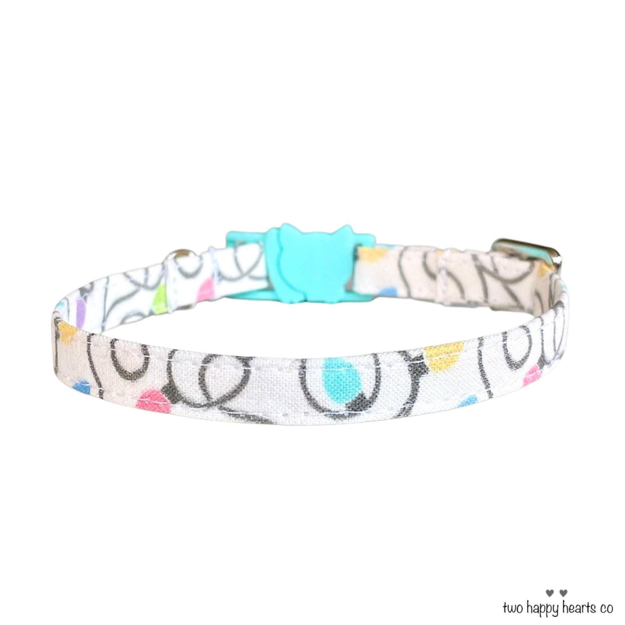 Add a festive sparkle to your pet's holiday look with this charming collar featuring Christmas lights cat motifs and a vibrant teal holiday pattern. Designed for small dogs and kittens, this accessory blends safety and style effortlessly, with options for both breakaway and non-breakaway buckles to suit your pet’s needs. Whether you're dressing up for festive gatherings or gifting a small dog accessory, this collar brings joyful cheer to every celebration.